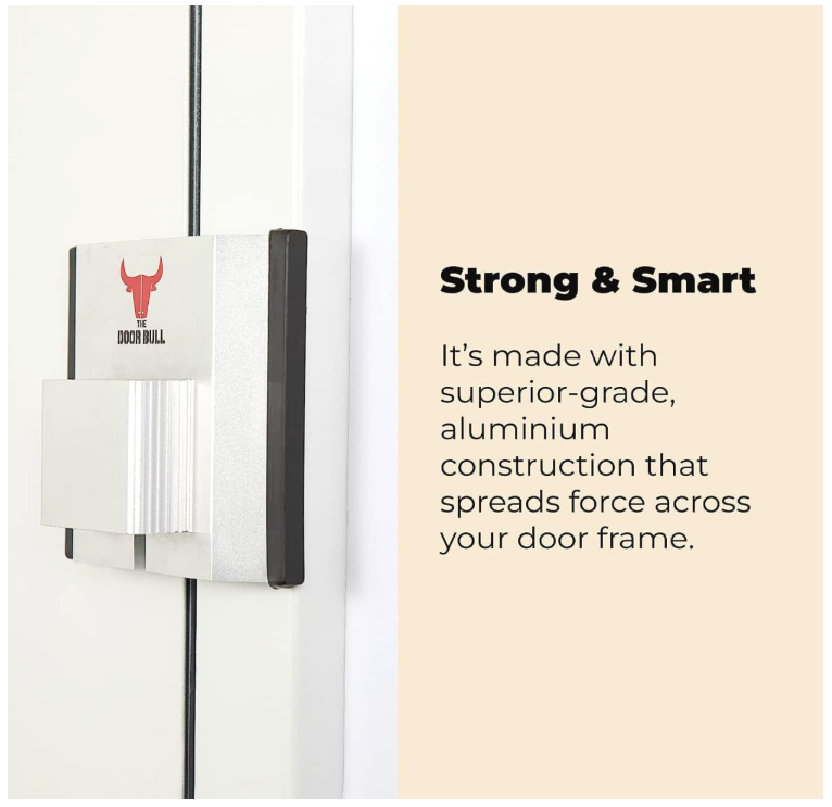 The Door Bull’s patented design uses your door frame’s strength to stop forced entry cold.